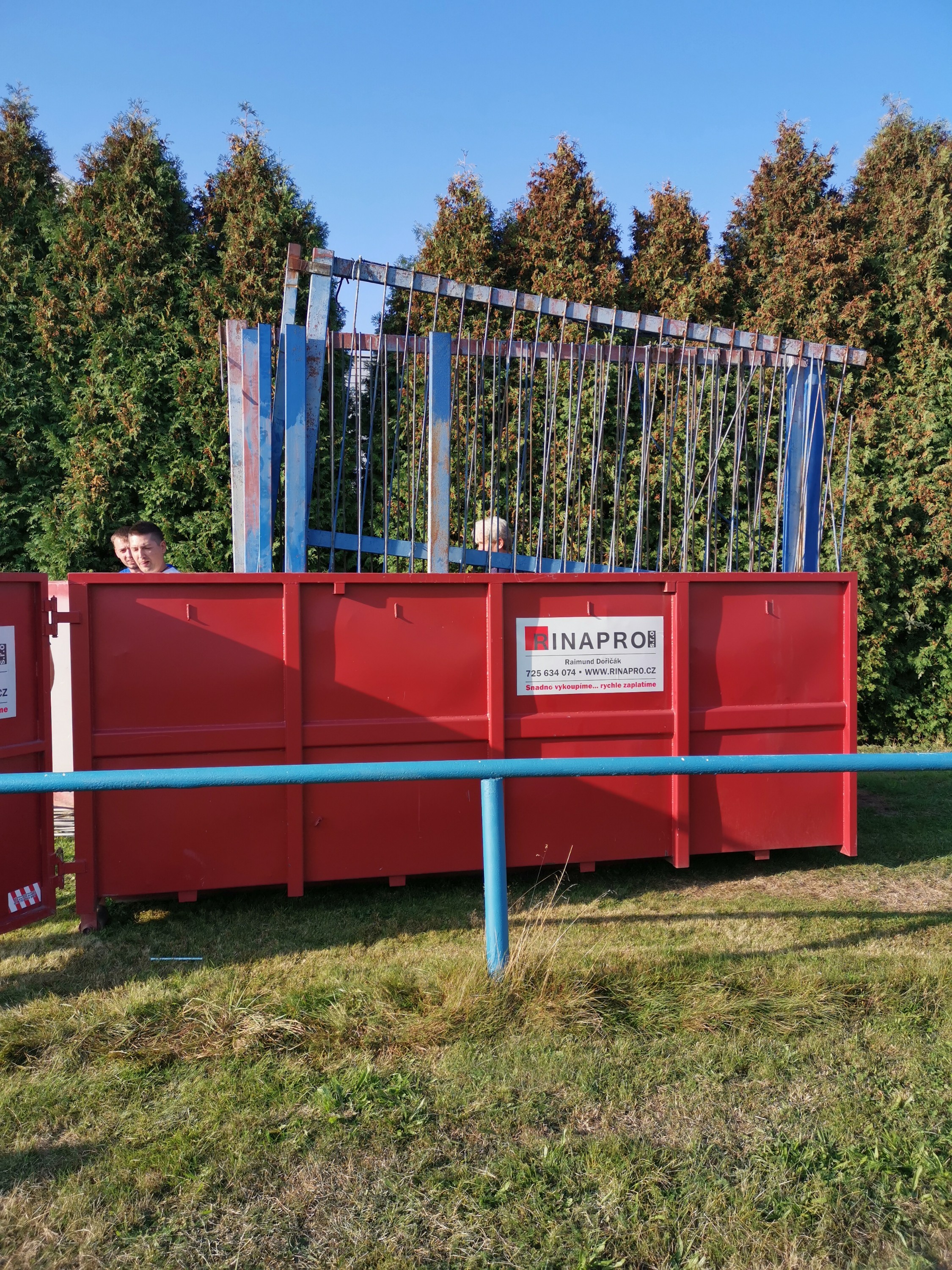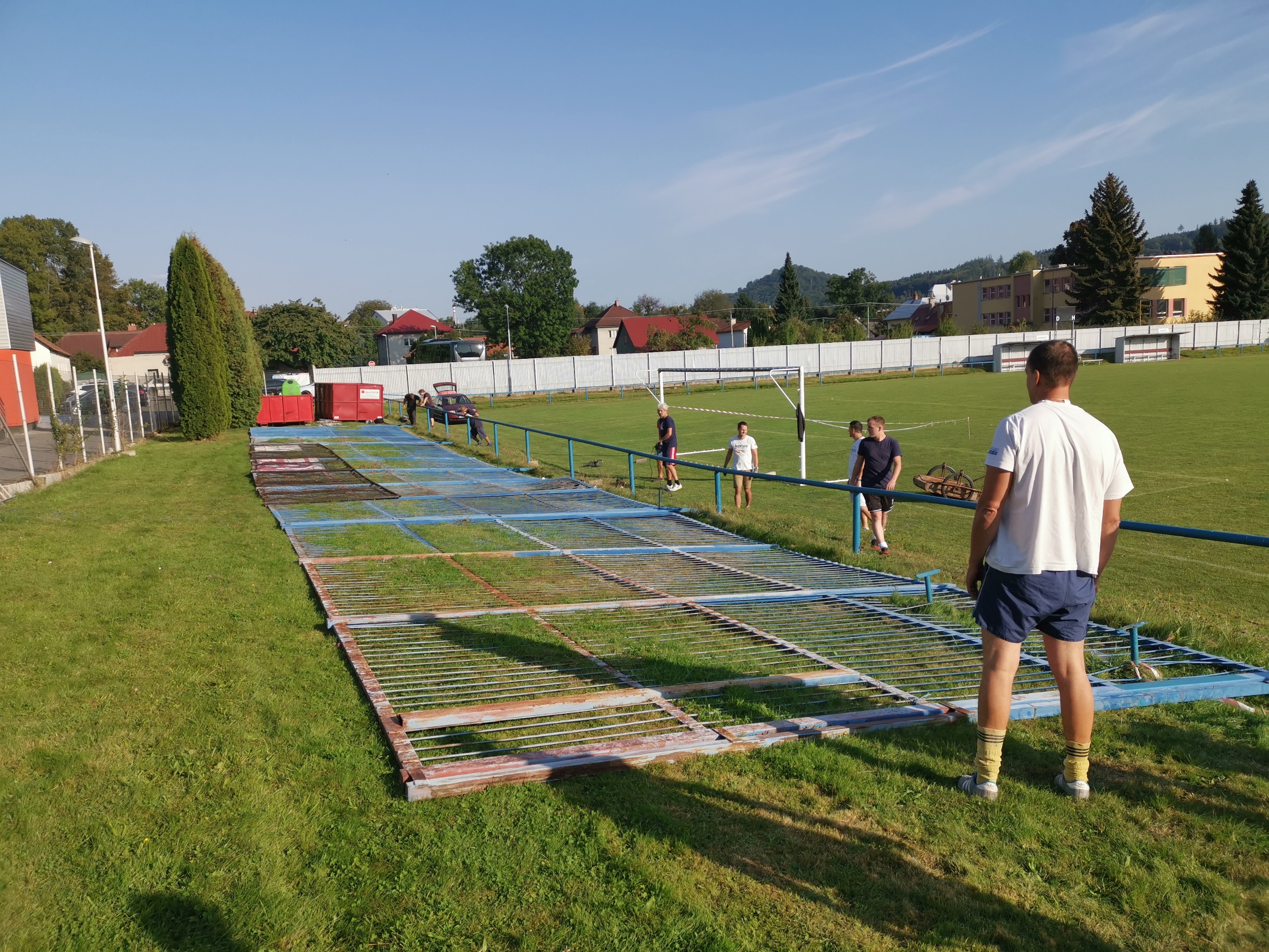 K tomu všemu dnes 21. 9. 2020 proběhla brigáda při které padly zábrany za hlavní bránou směrem k hale. Ty byly na svém místě už po dobu 25 let, ale v posledním roce byly v havarijním stavu – především uhnívaly/rezivěly nosné železné pilíře a hrozil samovolný pád těchto zábran. Proto moc děkuji všem, kteří si dneska našli chvíli a přišli pomoct s odstraněním těchto starých zábran. Šlo to rychle a za chvíli byly zábrany rozřezány a odneseny do připravených kontejnerů Brzy by se za bránou směrem k hale měly objevit opět nové a moderní zábrany. Ještě jednou moc děkuji všem pracantům za pomoc.