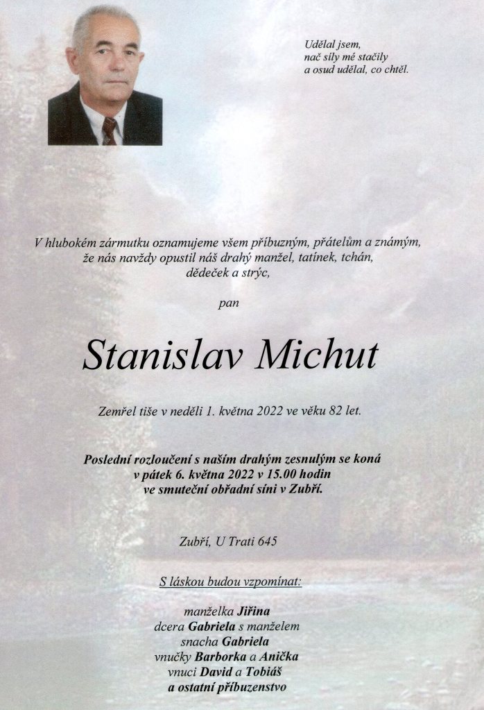 Pokud se alespoň trochu zajímáte o zuberskou kopanou, určitě Vám toto jméno nebude cizí. Staňa Michut byl nedílnou součástí FC Zubří několik desítek let, obětoval fotbalu v Zubří mnoho svého času a úsilí. Byl nesmírně pracovitý, odhodlaný a hlavně ochotný vždy komukoliv pomoci, slovo nejde pro něj neexistovalo. Podílel se přímo na vedení klubu, když byl stále aktivní člen výboru. Dlouhá léta mohli muži po každém domácím zápase obdivovat jeho výborné kuchařské umění.