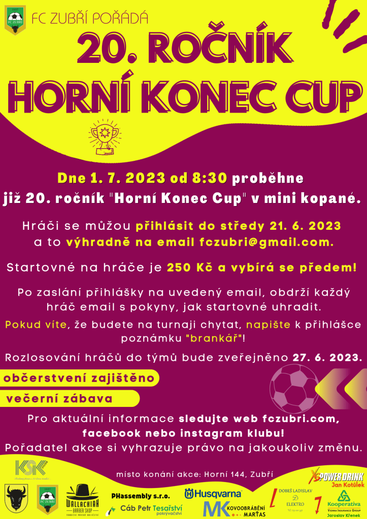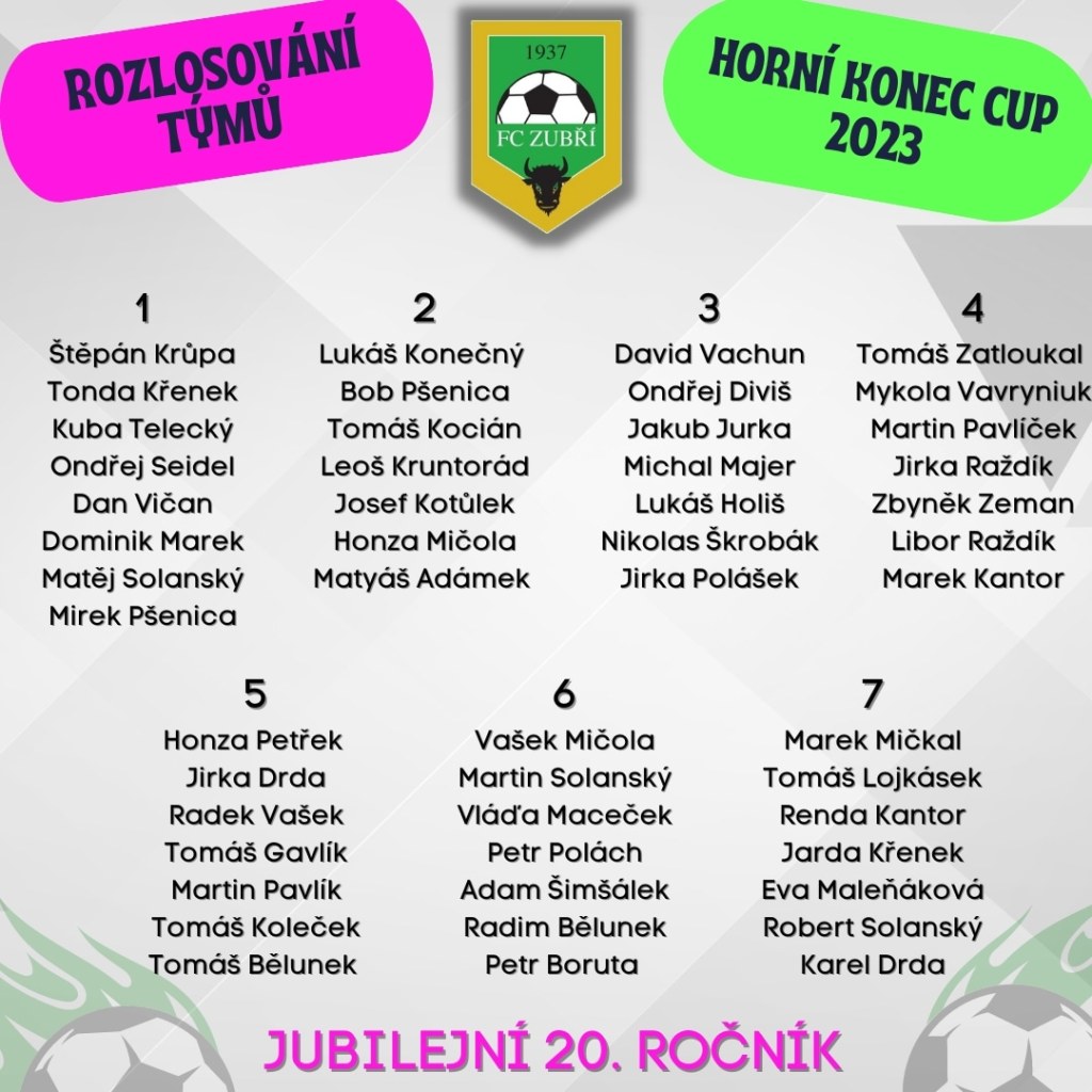 V sobotu 1. 7. vypukne již 20. ročník oblíbeného zuberského turnaje. Včera se rozlosovaly týmy, kterých je rekordně sedm! Prosím hlavně hráče, aby se seznámili s pokyny a pravidly, ať pak nejsou na turnaji něčím překvapeni (což někteří stejně budou 😃).