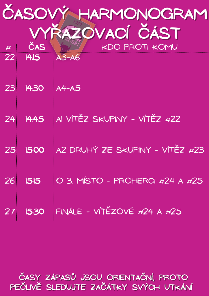 Tak v sobotu dobrou náladu s sebou, nezapomeňte být na místě včas, jelikož v 8:30 se hraje už první zápas! Všechny ostatní informace jsou pak na grafice níže.