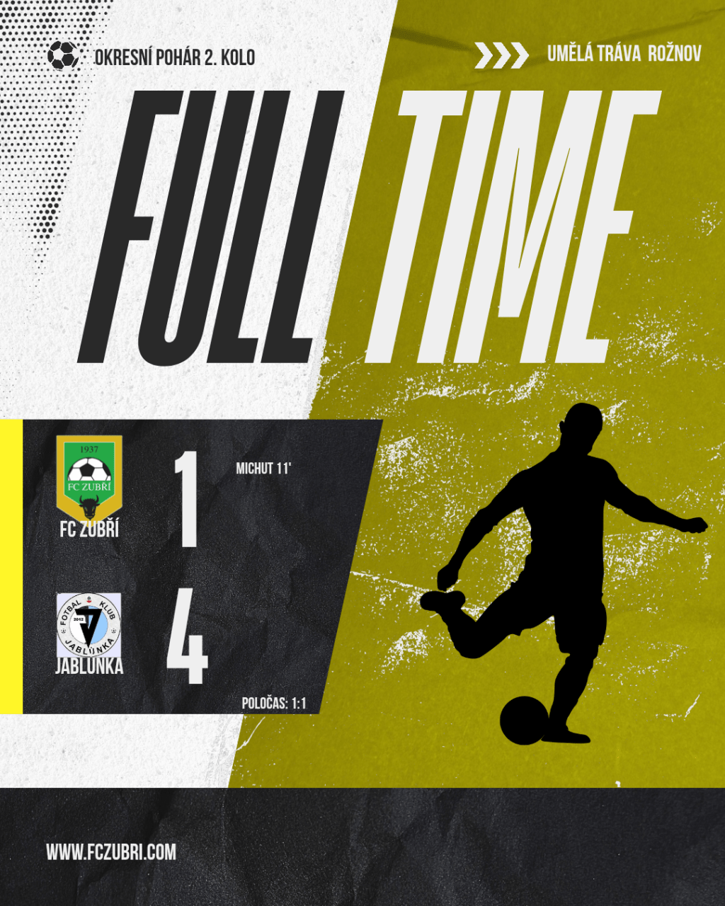 V utkání okresního poháru jsme na umělé trávě v Rožnově přivítali Jablůnku. Do zápasu jsme nastoupili výrazně omlazení – do hry zasáhlo hned šest našich dorostenců. I přes tuto situaci jsme odehráli velmi solidní utkání, ve kterém jsme dlouho drželi nadějný výsledek. Nakonec jsme však podlehli Jablůnce 1:4.
