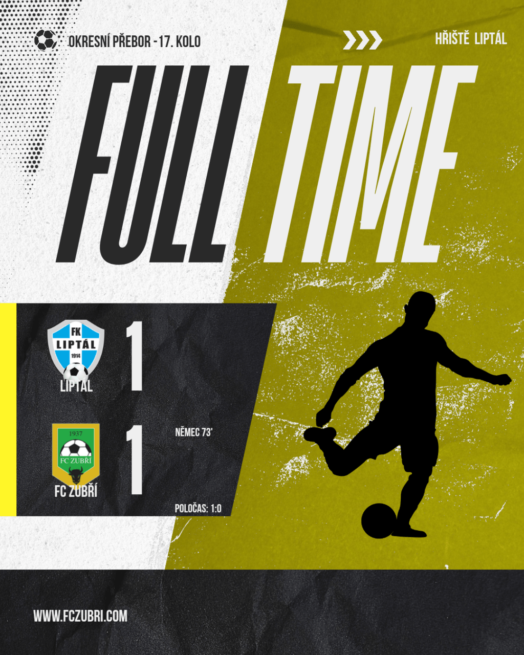 Zápas tak končí remízou, která vzhledem k průběhu dává smysl – každý tým vládl jednomu poločasu. I když my jsme těch vyložených šancí měli hromadu a Liptál se v druhé půli skoro k naší bráně ani nedostal.